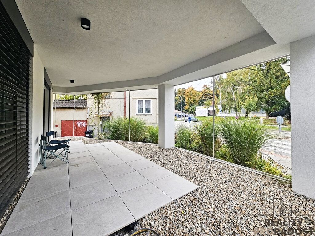 K dispozici je kancelář o výměre 40 m2 s možností přepažení na dvě místnosti, koupelna s prostorným sprchovým koutem, toaletou, umyvadlem a možností připojení pračky nebo myčky nádobí a vstupní chodba s možností vybudování úložných prostor. V celém prostoru je na podlaze keramická dlažba v dekoru imitace betonu s podlahovým elektrickým vytápěním. Přijemný detail kanceláře tvoři přiznané betonové stropy. Ohřev vody boilerem, rekuperace vzduchu. V kanceláři je kuchyňský kout. K přístupu na zastřešenou venkovní terasu slouží dvě francouzská okna v prostoru kanceláře. Při přepažení prostoru na dvě místnosti by byl zachován vstup na terasu z obou místností. Na všech oknech předokenní rolety.