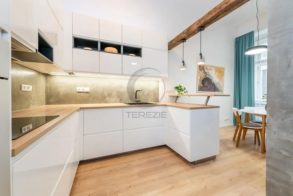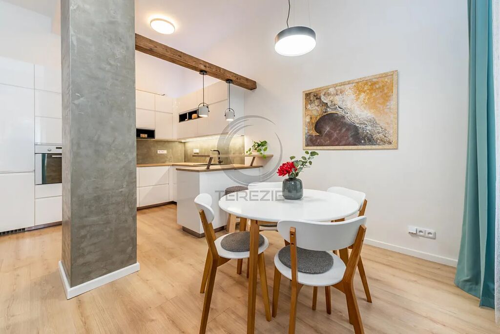- Obývací pokoj s plně vybavenou kuchyní (indukční deska, myčka, vestavěná TV) a útulným jídelním koutem