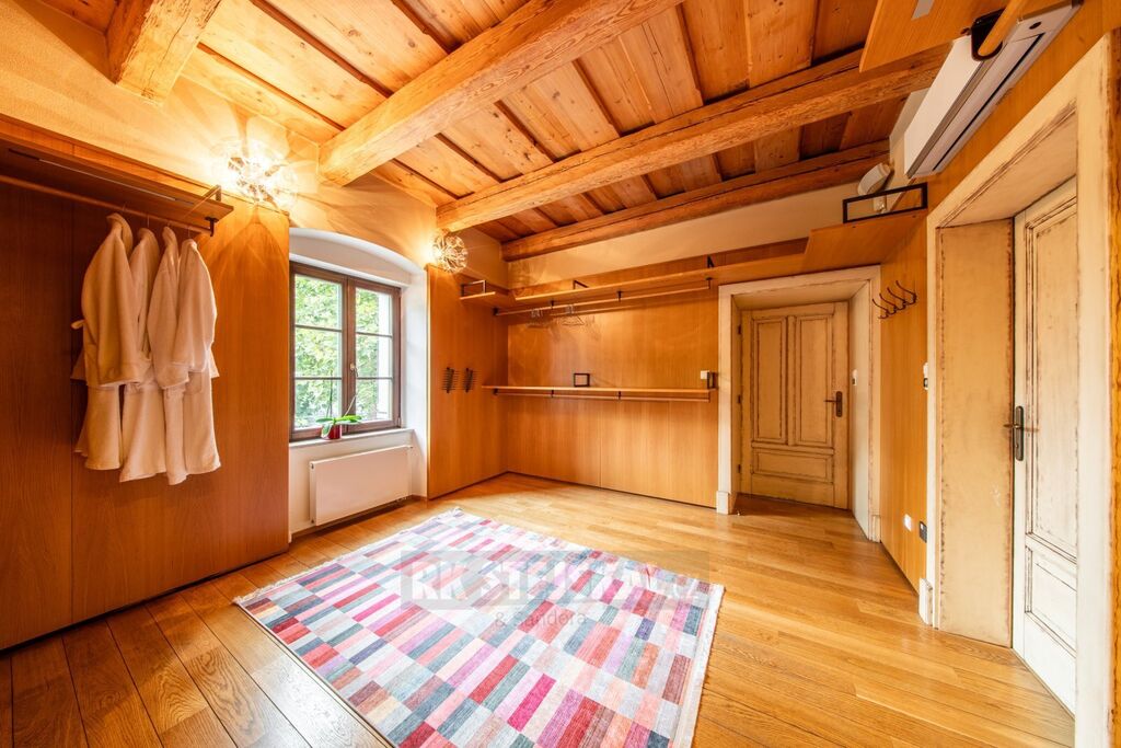 Hlavní stavba - rozlehlá rezidence do U s vnitřním nádvořím, garáže, hostinský byt, technická místnost, kancelář, archiv, serverovna, sociál a kuch. zázemí pro kancelář, bazénová místnost, wellness se saunou a kompletním zázemím, průchozí do RD přízemní části hlavní stavby, kde je obývací pokoj, kuchyňská místnost s jídelním prostorem, prosklení a vstupy do zahrady a na terasy, šatna, koupelna, komory a WC, ložnice, prostorné zádveří pro hlavní vstup do RD části z nádvoří, vstup do suterénu, hala se schodištěm do patra, v patře vstupní místnost vhodná jako průchozí obývací pokoj, zrcadlově pak dvakrát šatna s koupelnou, samostatná WC a prostorné ložnice, v suterénu domu pak dvě vinotéky a hodovna, dále pak sklepní místnost a samostatné WC,