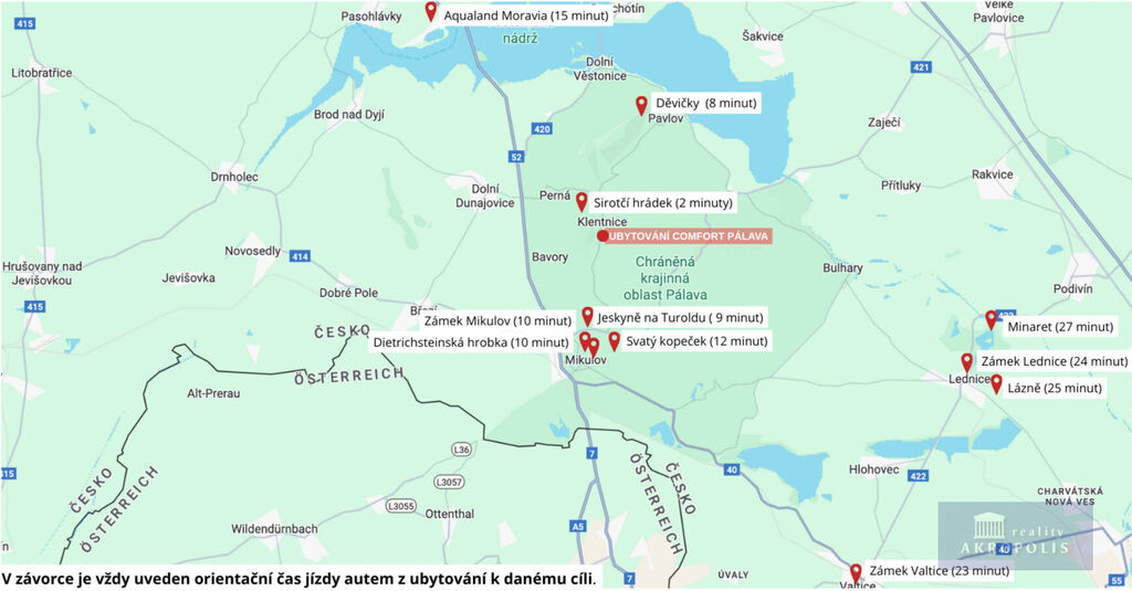 Výjimečná je i lokalita – v bezprostředním okolí se nachází Mikulov se zámkem a kulturním centrem, Aqualand Moravia největší vodní svět v ČR, Novomlýnské nádrže s možností koupání a vodních sportů či světově proslulý Lednicko-valtický areál. Díky dopravní dostupnosti z Brna (40 minut) a Vídně (70 minut) se jedná o mimořádně atraktivní investiční příležitost.