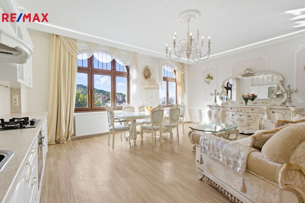 Chcete žít jako na zámku? Tento byt je ideální volbou. Nabízíme k prodeji výjimečný byt, zařízený ve stylu připomínajícím zlatou éru evropských zámků. Tento interiér spojuje bohatě zdobený nábytek, křišťálové lustry a elegantní detaily do jedinečného celku. Nachází se v lázeňské zóně Karlových Varů, na prestižní Ondřejské ulici, v bezprostřední blízkosti Vřídelní kolonády a romantických lázeňských parků.