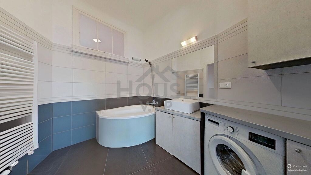 Byt se nabízí s plně vybavenou kuchyňskou linkou se zabudovanými spotřebiči - lednice, myčka, mikrovlnná trouba, digestoř, plynová trouba a sporák. V prostorné koupelně s rohovou vanou je umístěna pračka. WC je samostatné.