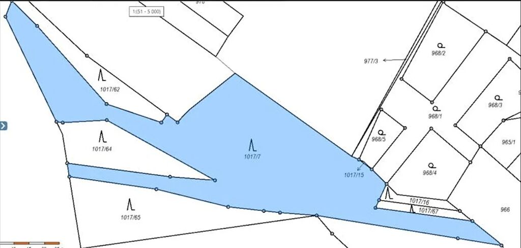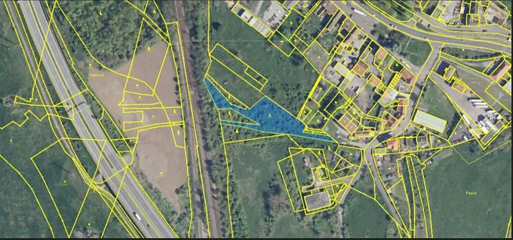 Lesní pozemek na okraji zastavěného území, leží mezi stavbami a železniční tratí.