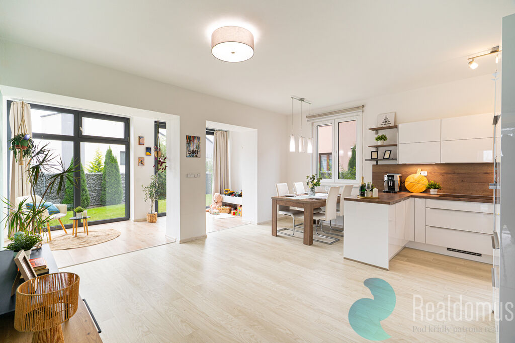 Tato elegantní luxusní stavba byla dokončena v roce 2019. Jedná se o polovinu dvojdomu (mezonetovou bytovou jednotku) o dispozici 5+kk s garáží, zahradou a terasou.