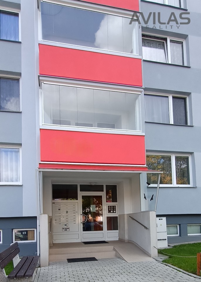 Dispozice bytu: obývací pokoj 21,4 m2, kuchyň 9,6 m2, koupelna s vanou a samostatné wc, vstupní chodba 6,5m2. K bytu náleží sklepní koje.