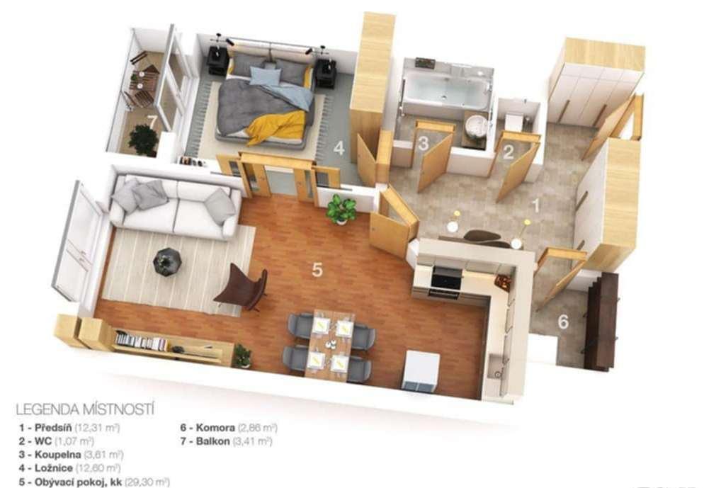 Dispozice bytu je promyšlená: z předsíně vstoupíte do prostorného obývacího pokoje spojeného s kuchyňskou linkou, dále ložnice s přístupem na balkón, koupelny, samostatného WC a praktické komory. Balkon je orientován do klidného vnitrobloku se vzrostlými stromy, které zajišťují naprosté soukromí a příjemnou atmosféru.