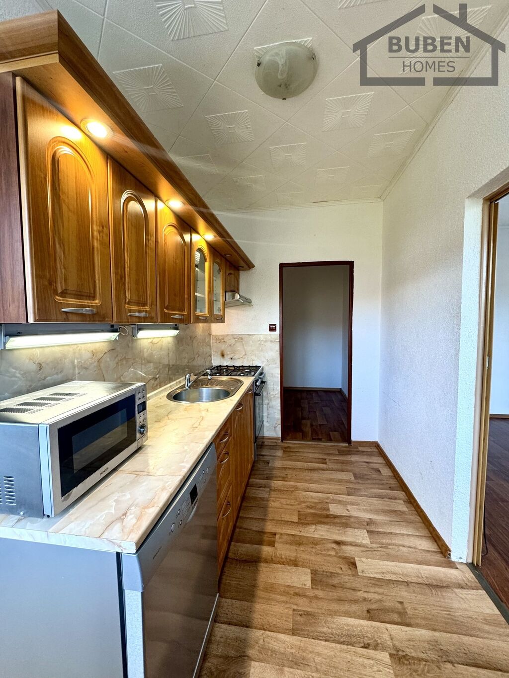 Byt tvoří prostorná vstupní chodba, kuchyň, prostorný obývací pokoj (16,30 m2), dvě ložnice (12m2, 16 m2), koupelna se sprchovým koutem a samostatné WC.