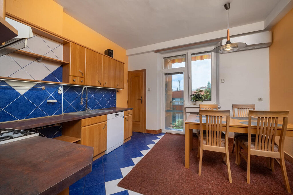 Tento prostorný byt s užitnou plochou 93 metrů čtverečních je v pěkném, udržovaném stavu a nabízí vše, co pro pohodlný rodinný život potřebujete. Místnosti v bytě jsou klimatizované, dům je zateplený a proběhla zde výměna oken i stoupaček. Součástí bytu je také větší sklepní kóje a balkon. Další výhodou je využití společné kolárny, sušárny a prostorné půdy v domě.