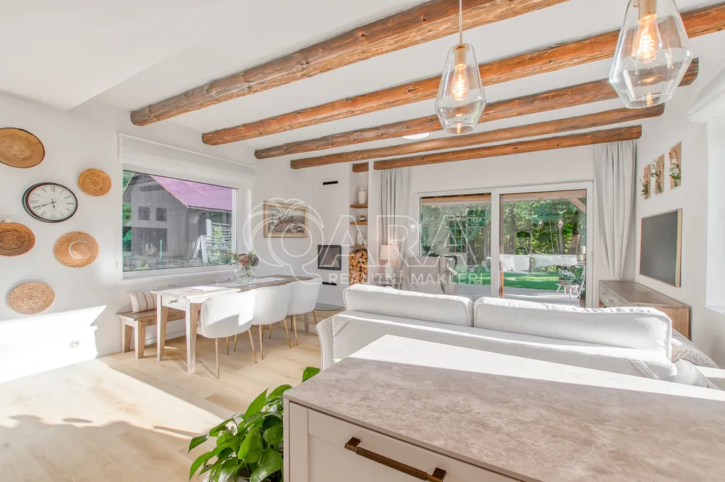 Interiér je navržen s ohledem na maximální využití prostoru a elegance. Hlavní obytná část s kuchyňským koutem je srdcem domu. Kuchyně je v laku, vyrobená na míru a vybavená kvalitními vestavnými spotřebiči.