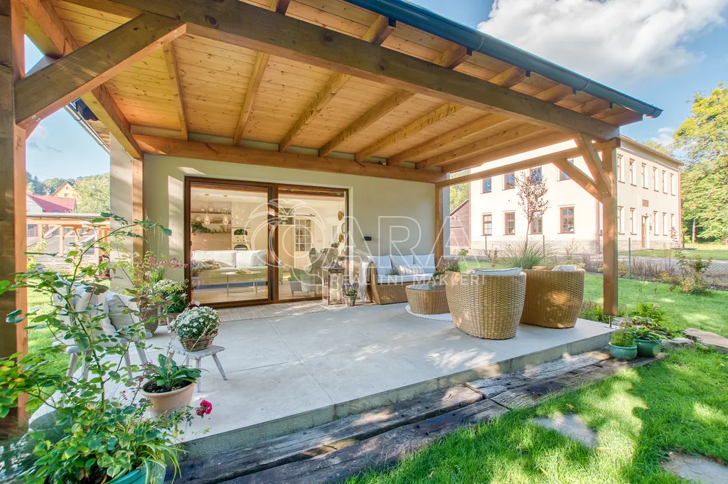 Exteriér: Zahrada s krásnou pergolou a výhledem do lesa je stvořena pro odpočinek. Parkování pro čtyři auta je zajištěno. Velký bonus: Pozemek o rozloze 1280 m² umožňuje jeho zastavitelnost pro budoucí rozšíření domu o další pokoje!