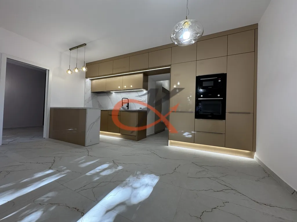 Dominantou bytu je luxusní kuchyňská linka v třpytivě zlatém dekoru, doplněná černými vestavěnými spotřebiči Bosch – indukční varná deska, horkovzdušná i mikrovlnná trouba, myčka, digestoř a lednice s mrazákem. Linka je osazena výsuvnými systémy značky Blum pro maximální komfort a kvalitu zpracování.