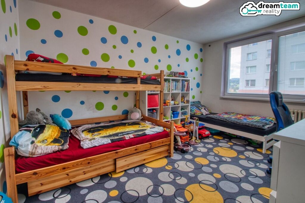 Dětský pokoj je ten celý puntíkovaný, ale to jste asi poznali. Je dostatečně prostorný. Kromě asi tak miliónu puntíků sem vejde i spaní pro tři děti a dokonce i pracovní stůl pro školáky. Stejně jako ložnice je na jih, plný světla a s výhledem do klidové zóny mezi domy. Tak mi zavolejte, ať vám to všechno ukážu osobně.