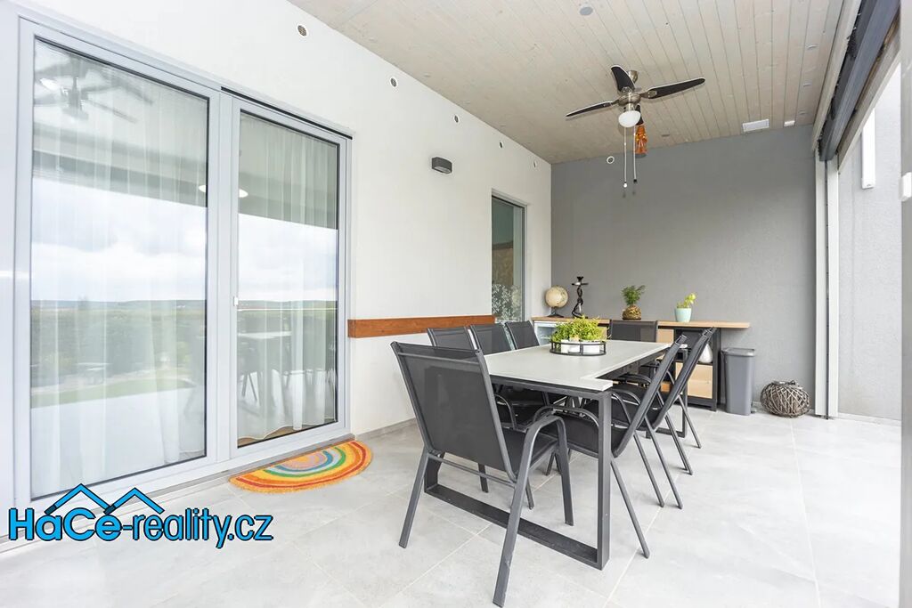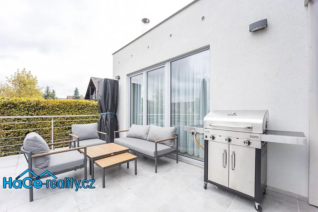 Prostorná terasa je ideální místo pro letní grilování, ranní kávu pod širým nebem nebo večerní posezení s přáteli při západu slunce.