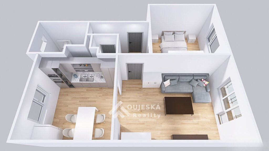 Byt o velikosti 62 m² se nachází v 1. patře cihlového domu. Nabízí pohodlný obývací pokoj, kuchyňský kout s jídelnou, prostornou ložnici, koupelnu s vanou a samostatné WC. K dispozici je také balkon.