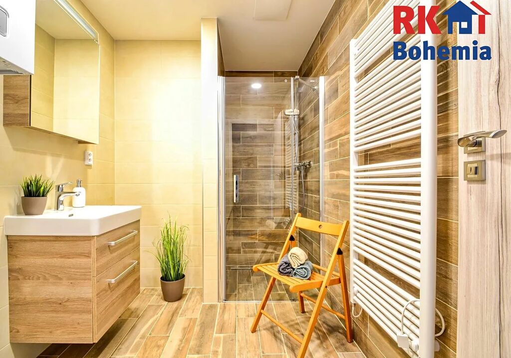 V koupelně se nachází sprchový kout, umyvadlo a příprava na pračku.