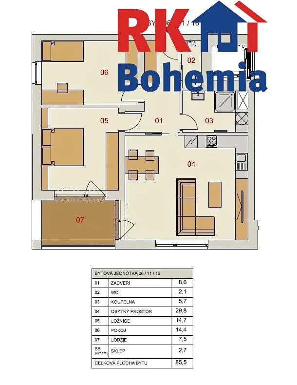 Byt se nachází ve 4. NP pětipodlažního domu s výtahem a má výměru 75,3 m2 + lodžie 7,5 m2. Byt se skládá ze zádveří (8,6 m2), koupelny se sprchovým koutem (5,7 m2), samostatného WC TECE ONE s integrovanou bidetovou sprchou (2,1 m2), obývacího pokoje s kuchyňským koutem (29,8 m2), ložnice (14,7 m2), pokoje (14,4 m2) a lodžie (7,5 m2).