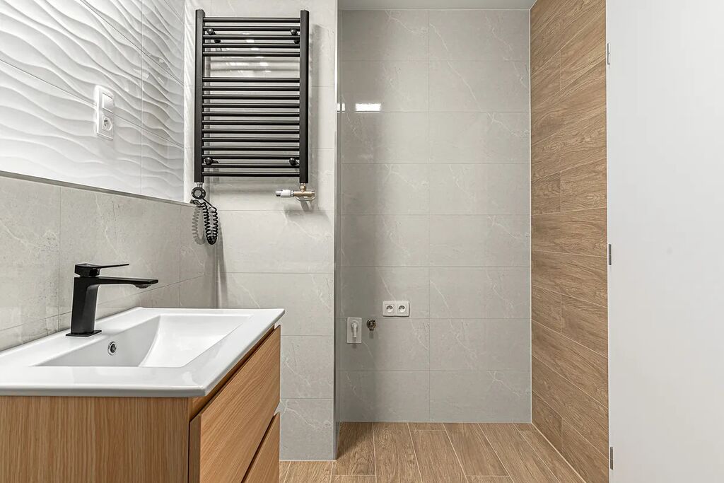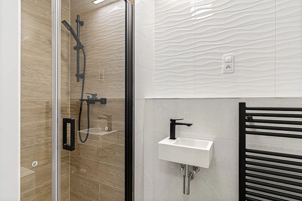 - dva koupelnové prostory – hlavní koupelna s vanou, WC a přípravou pro pračku a sušičku, dále druhá koupelna se sprchovým koutem a WC,