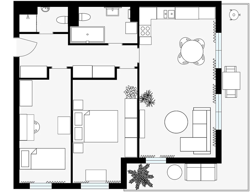 Srdcem bytu je prostorný obývací pokoj s kuchyňským koutem, který se otevírá na terasu o rozloze 20 m², orientovanou na jihovýchod. Díky této orientaci je obytný prostor příjemně prosvětlený od ranních hodin a terasa se stává ideálním místem pro snídani na čerstvém vzduchu, hry s dětmi či večerní posezení. Ložnice a druhý pokoj, orientované na severovýchod, poskytují klidné zázemí pro odpočinek i soustředěnou práci.
