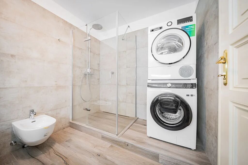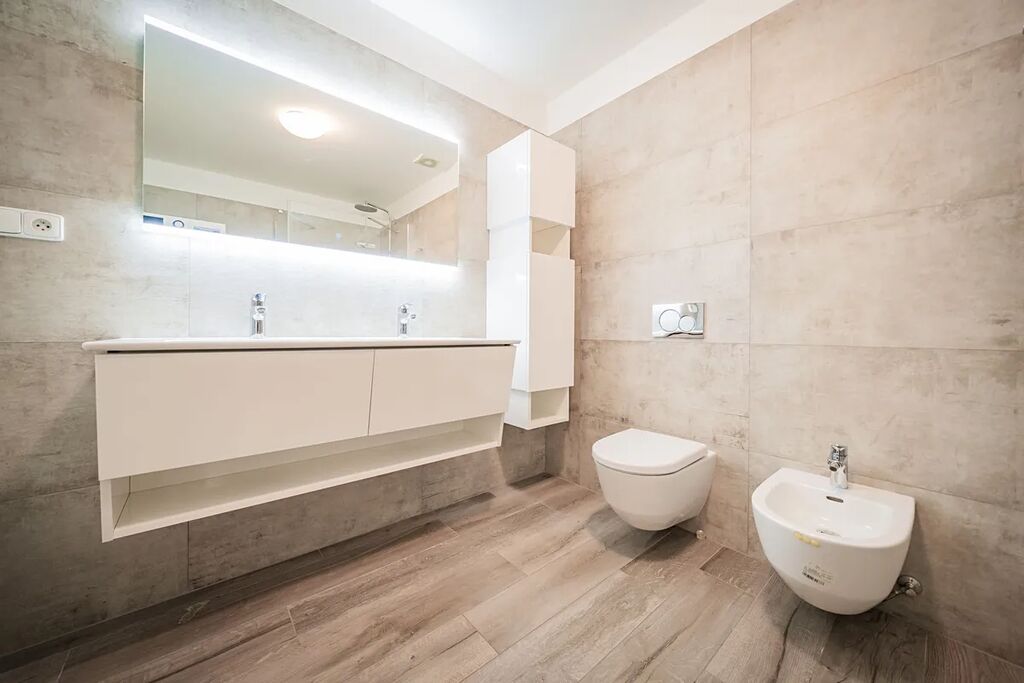 Byt je nezařízený a dispozičně sestává ze vstupní haly, prostorného obývacího pokoje s krbem, propojeného s kuchyňskou částí s novou moderní kuchyňskou linkou s vestavěnými spotřebiči: varná deska, trouba, mikrovlnná trouba, myčka, lednice s mrazákem), 3 oddělených ložnic (jedna z ložnic disponuje vlastní koupelnou ), 2 koupelny (jedna s vanou, toaletou a bidetem a druhá se sprchovým koutem, bidetem, toaletou a vybavená pračkou a sušičkou) a samostatné WC. K dispozici je i sklep.