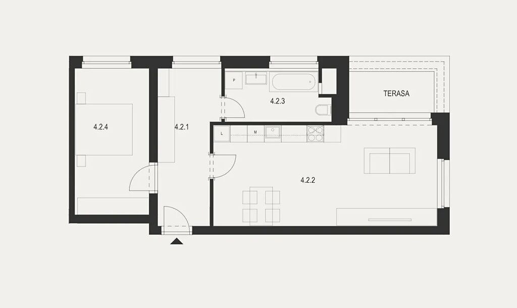 Projekt Obytná zóna Hvízdalka nabízí byt 2+kk s výměrou podlahové plochy 65,11 m2. Dispozičně se člení na prostornou vstupní chodbu s oknem, koupelnu s vanou, WC, umyvadlem a prostorem pro umístění pračky, ložnici a hlavní obytnou místnost s kuchyňským koutem a vstupem na terasu (4,35 m2). Byt je orientovaný jihovýchodním směrem, což zajistí dostatek světla. Koupelna je prakticky rozmístěna a přirozené světlo i odvětrání zajistí podélné okno nad vanou. Terasa jihozápadním směrem umožňuje využití téměř po celý rok.