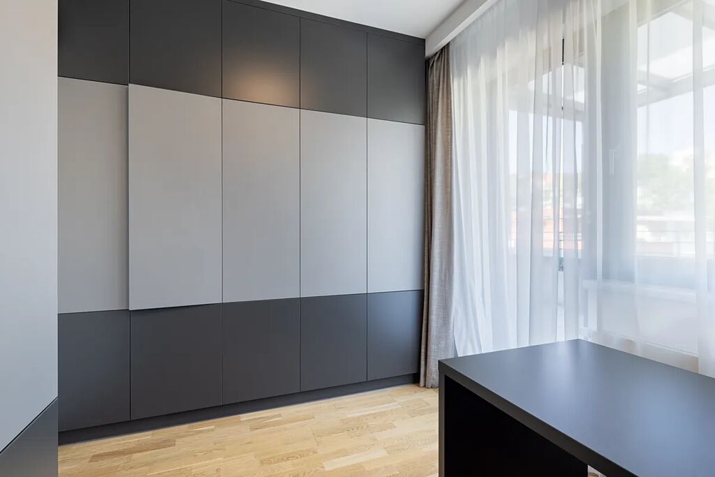 Veškerý nábytek v bytě je na míru a nabízí dostatek úložných prostor