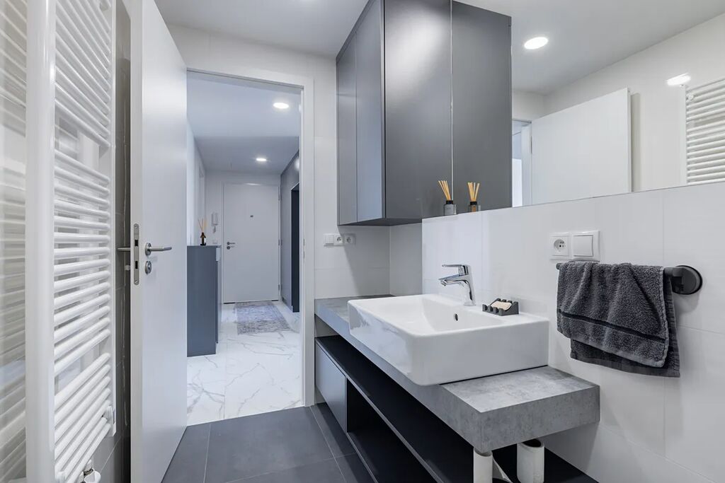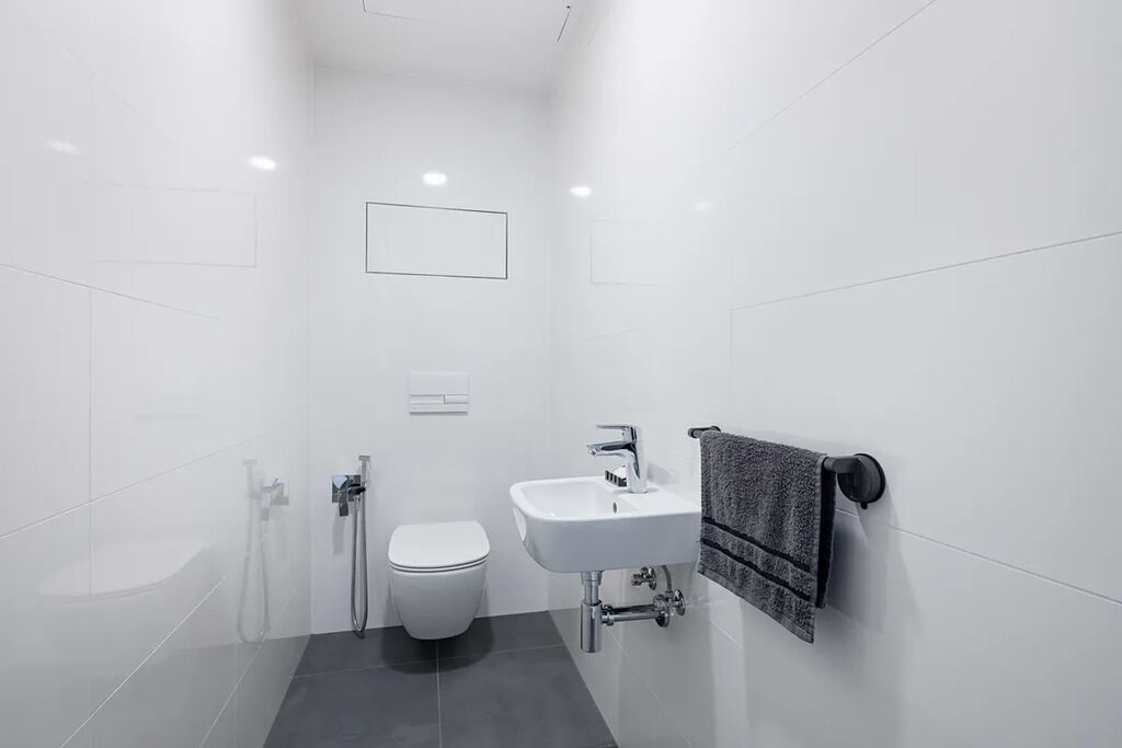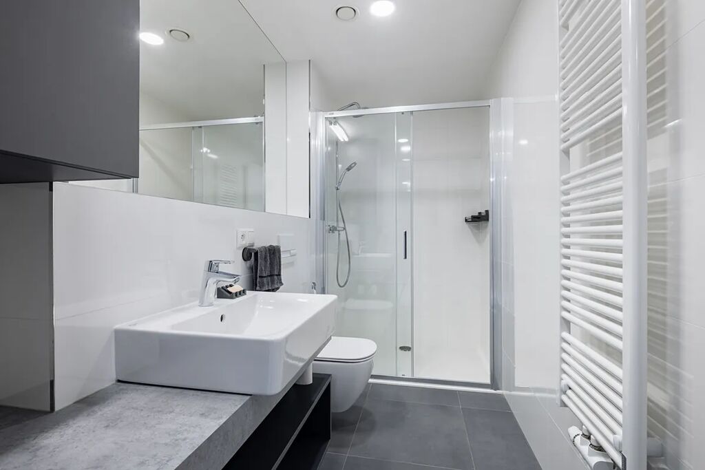 Koupelna s velkoformátovými obklady a sprchovým koutem