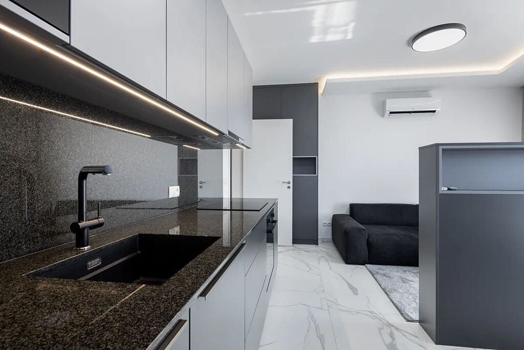 Prostorný obývací pokoj s plně vybavenou kuchyňskou linkou (spotřebiče Bosch)