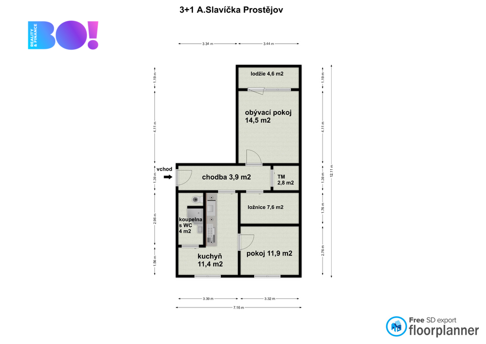 Dispozice: vstupní chodba, kuchyně s jídelním koutem, obývací pokoj s balkonem, dva samostatné pokoje, koupelna se sprchovým koutem a WC, šatna s úložnými prostory.