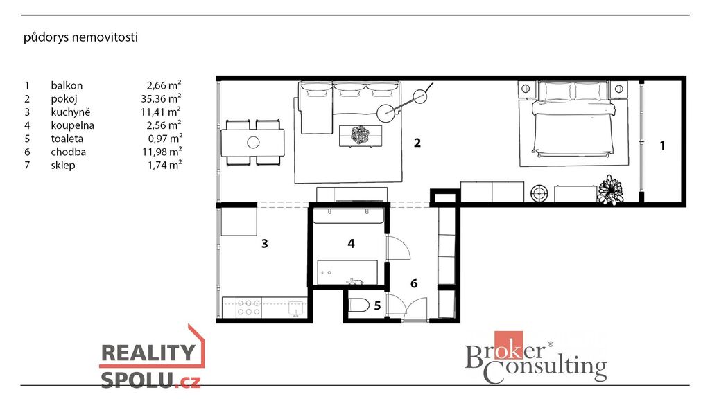Byt tvoří prostorný obývací pokoj s kuchyňským koutem, ložnice, koupelna s vanou a samostatné WC. Kuchyně je vybavena funkční linkou, v chodbě je dostatek úložného prostoru. Díky vysokému podlaží je byt světlý a klidný, s výhledem do okolí.