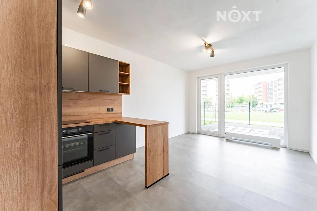Představuje jej pokoj s kuchyňským koutem, chodba a koupelna, kde se nachází sprchový kout, umyvadlo se zrcadlovou skříňkou a wc. Je zde i prostor na pračku se sušičkou. Kuchyňská linka bude nově instalována – na fotografii je její vizualizace. Její součástí bude vestavěná lednice a mrazák, elektrická trouba, indukční varná deska a digestoř. Z pokoje vyjdete na předzahrádku o velikosti 17 m2, ideální pro ranní kávu, večerní relax nebo pěstování bylinek.