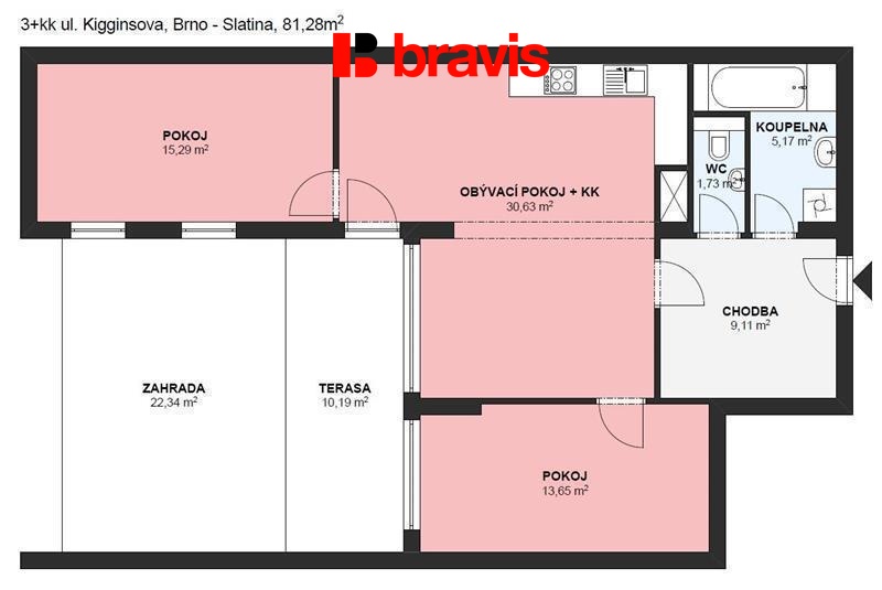 obývací pokoj s kuchyňským koutem 30,63 m2, ložnice 15,29 + 13,65 m2, koupelna s vanou, umyvadlem a připojením na pračku 5,17 m2, samostatná toaleta 1,73 m2, předsíň 9,11 m2.