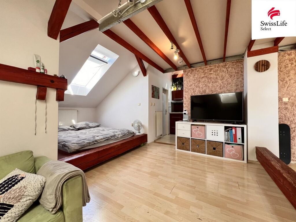 Nabízíme pronájem bytové jednotky v 4NP dobře udržovaného bytového domu o dispozici 1kk 65 m2, se sdílenou terasou cca 30 m2, na adrese Borská 47- 1 minutu od zastávky Plzeň - Jižní Předměstí. Byt sestává z obývací místnosti, z kuchyně, předsíně, koupelny s WC, mezonetového prostoru, komory. Bonusem tohoto bytu je terasa na střeše domu a výměře cca 30 m2 sdílená se sousedním bytem. Okna střešní plastová - orintace jihozápad - ideální pro milovníky tepla. Topení řešeno plynovým kotlem s časovým termostatem. Teplá voda z boileru. Velmi nízké náklady na vytápění.