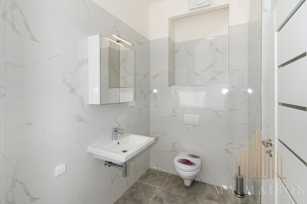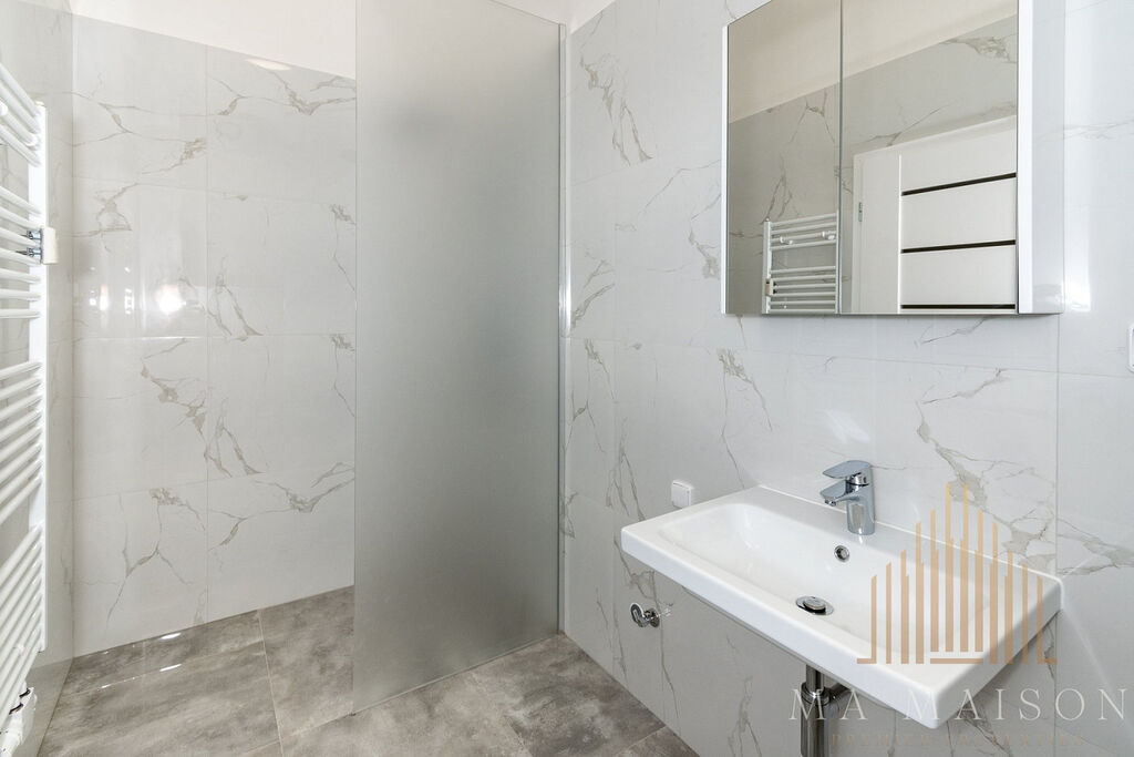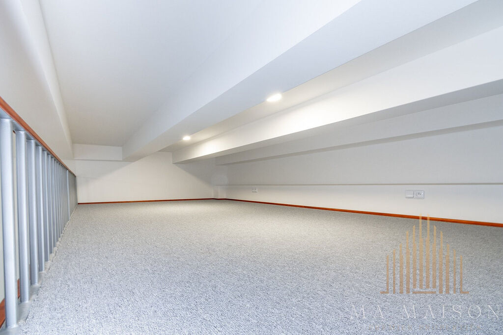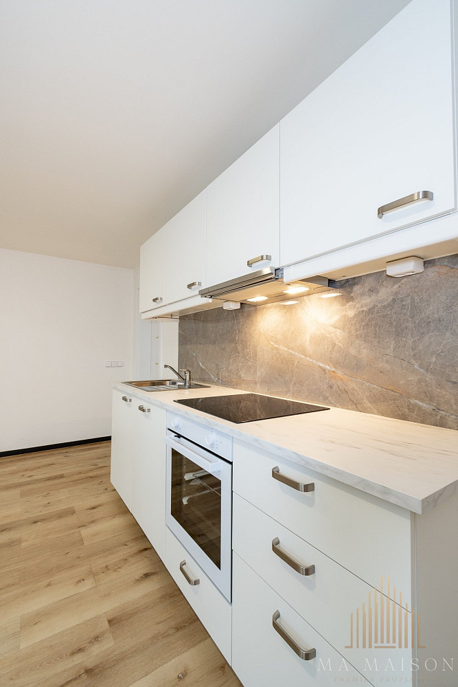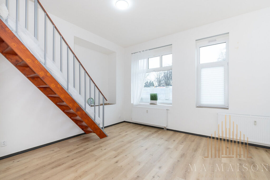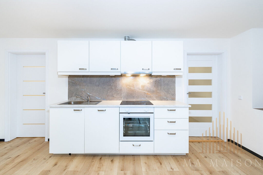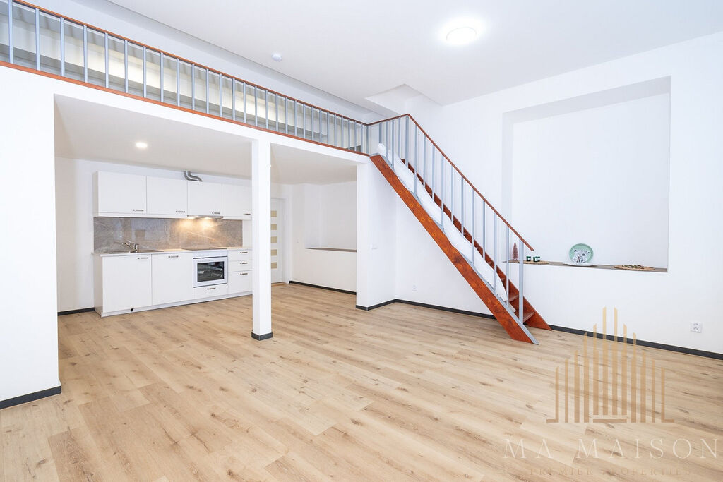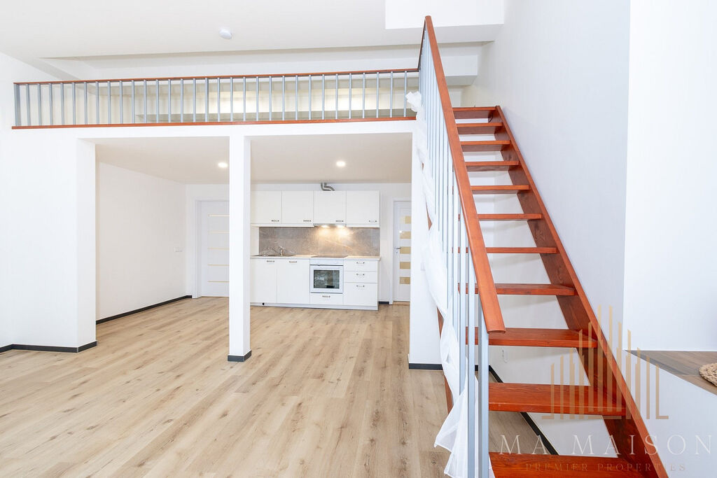 Byt zaujme svou originální dispozicí a netradičním mezipatrem o výšce 1 metr, které může sloužit jako spací zóna nebo praktický úložný prostor. Hlavní obytný prostor je propojen s moderní kuchyňskou linkou, vybavenou spotřebiči jako elektrická trouba, varná deska, digestoř a myčka.