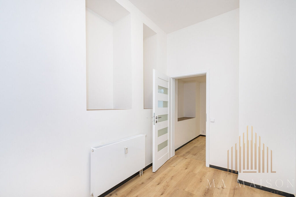 Velkorysá podlahová plocha bytu nabízí dostatek místa pro pohodlné zařízení obývací části i pracovního koutku. V bytě jsou velká okna, která zajišťují dostatek přirozeného světla a navozují příjemnou atmosféru.