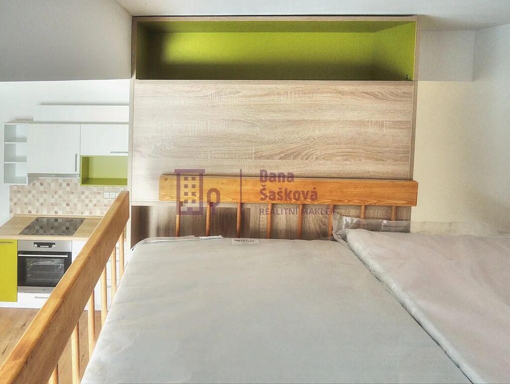 Dispozice 1+kk nabízí předsíň, koupelnu se sprchovým koutem a toaletou, obývací pokoj s kuchyňským koutem a vyvýšenou patrovou postelí.
