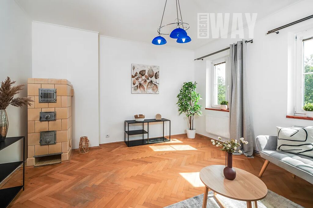 Cihlová stavba z poloviny 20. století s valbovou střechou a arkýři má přesně tu solidnost, kterou chcete od místa, kde budete žít. Fasáda je tradiční, schodiště poctivé betonové – a když vám někdo řekne, že „dům má charakter“, není to tentokrát fráze. Celý objekt prošel částečnou rekonstrukcí: nová střecha, nové rozvody, výměna oken a vchodových dveří. Zkrátka základ je pevný a modernizace už proběhla.