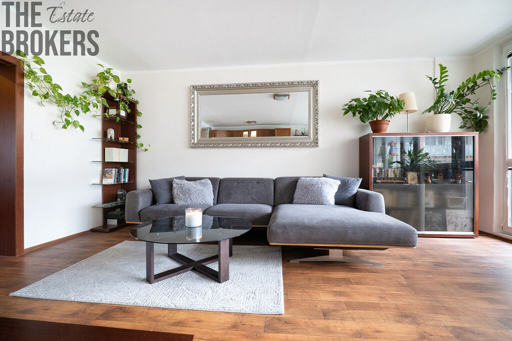 • prostorný obývací pokoj s kuchyňským koutem (31,58 m²) a vstupem na prosklenou lodžii (5,6 m²)