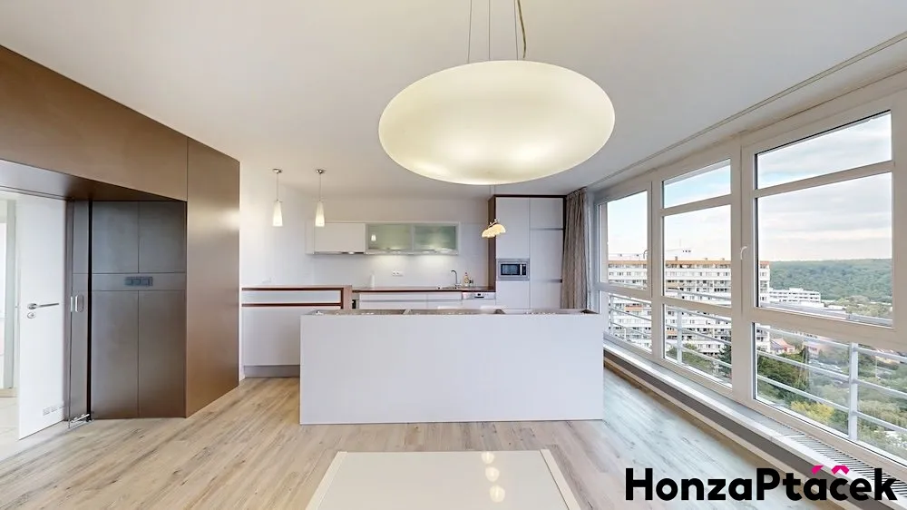 Pronájem exkluzivního bytu 3+kk s panoramatickým výhledem na Kunratický les (západ) a na centrum Prahy 4 (východ), celkem 108m2 z toho byt 89m2 + terasa 19m2 + 2 garážová stání + sklep. Byt se nachází v posledním patře nového moderního domu v Praze 4 Krči v blízkosti IKEMU a Kunratického lesa. Z terasy, obýváku a jídelny je nádherný výhled do parku na Kunratický les. Z ložnice a z pokoje je výhled na centrum Prahy 4. Byt je kompletně, moderně, účelově a vkusně zařízen. Kvalitní nábytek - vše zakázková výroba. K vybavení bytu dále patří kožená sedací souprava (bude dodána), postele, vestavěné skříně, jídelní stůl, židle, televize, vysavač, varná konvice, základní nádobí, žehlička, pračka, sušička, moderní kuchyňská linka s vestavěnými spotřebiči - myčka, mikrovlná trouba, polyfunkční trouba, sklokeramická deska, mrazák, lednice, klimatizace, pračka + sušička. Veškeré zařízení a vybavení bytu je moderní a velmi kvalitní. K bytu náleží garážové stání a sklep v 2.PP - bezpečnostní dveře. Dům se nachází v blízkosti několika lesů - Kunratický, Lhotecký, Kamýcký, Krčský a nedaleko přírodního parku Modřanská rokle. Jedná se o lokalitu s kompletní občanskou vybaveností a výbornou dostupností a to jak centra Prahy, tak Jížní spojky a Pražského okruhu. V blízkosti domu je stanice MHD, několik supermarketů, škol, školek, sportovních areálů, restaurací, pošta, apod. Byt je ihned k nastěhování.