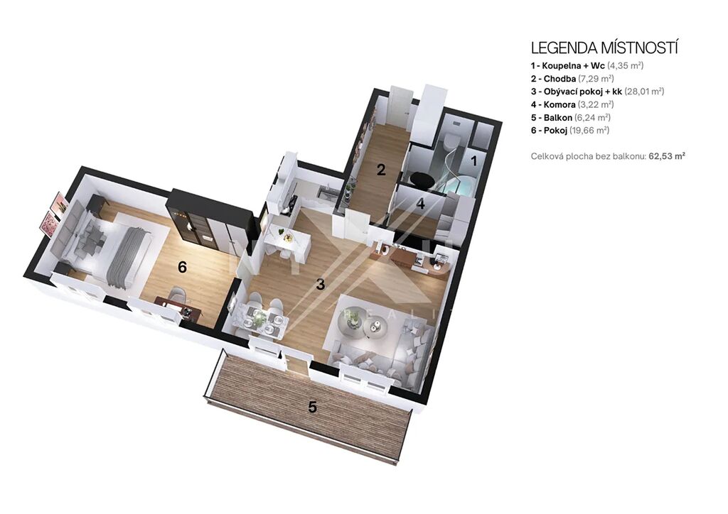 Užitná plocha bytu 63 m² sestává z chodby 7,3 m², koupelny s WC 4,4 m², komory 3,2 m², průchozího obývacího pokoje s kuchyňským koutem 28 m² a velkorysé ložnice 19,7 m². Z obývacího pokoje vede vstup na balkon 6,1 m² s nádherným výhledem.
