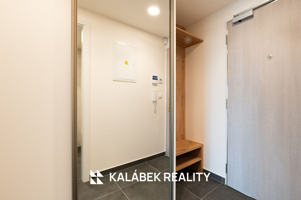 Dispozice bytu tvoří obývací prostor s plně vybavenou kuchyňskou linkou HANÁK (indukční deska, trouba, mikrovlnná trouba, lednice s mrazákem, myčka), koupelna se sprchovým koutem a WC, a vstupní chodba s vestavěnou skříní na míru. Z obytné části je vstup na lodžii orientovanou na východ. Byt je vybaven systémem řízeného větrání s rekuperací tepla. Dále je součástí standardu zabezpečovací systém Jablotron. Energetická třída B.