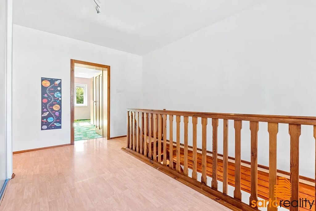 Po dřevěných schodech se dostaneme do 2.NP - dětský pokoj, ložnice, koupelna s rohovou vanou a WC, praktická