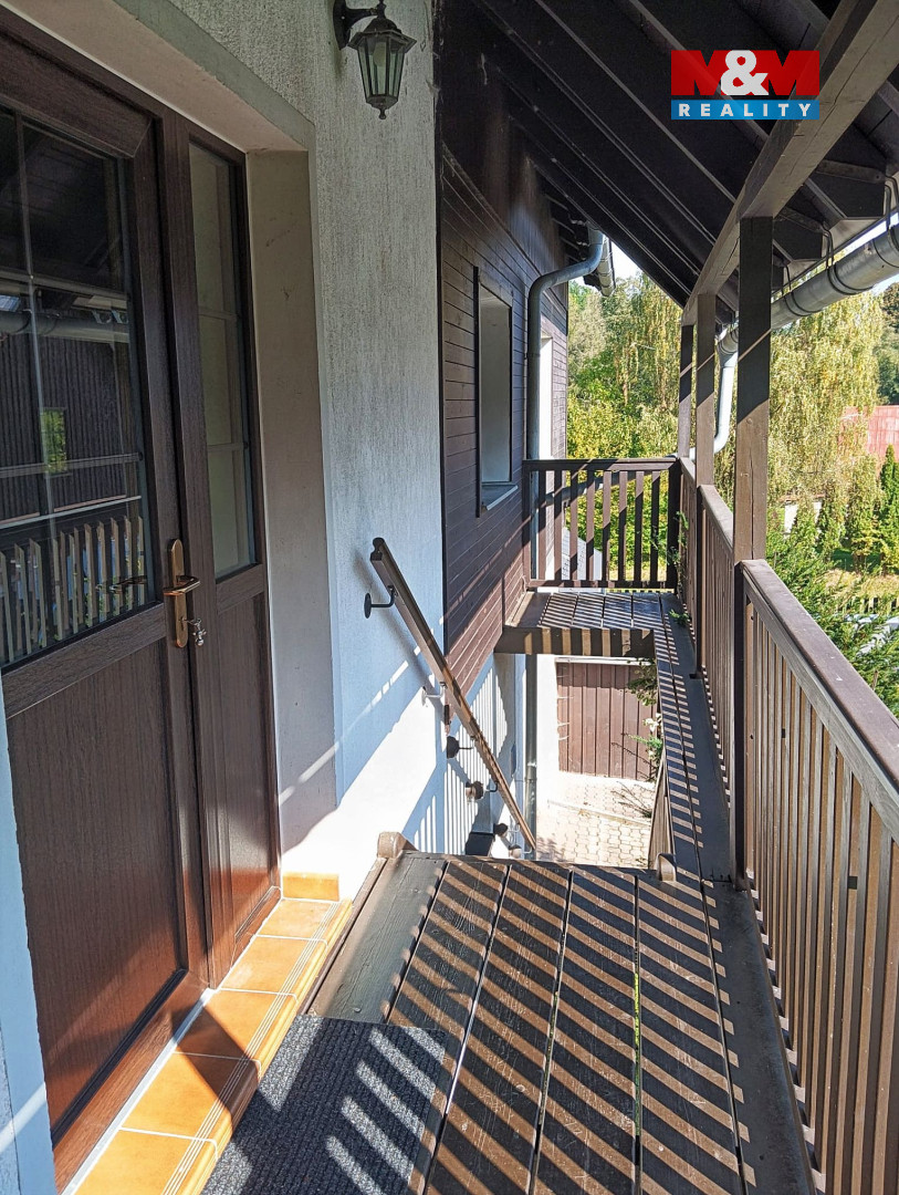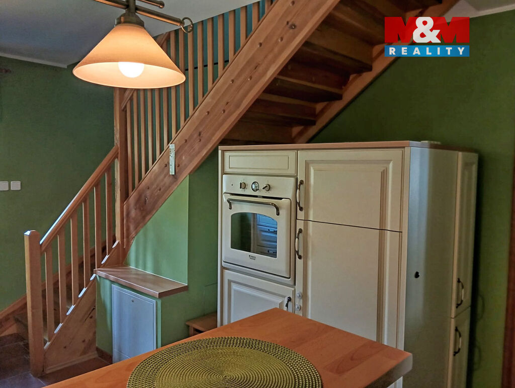Z kuchyně vede dřevěné schodiště do mezonetu, kde je další pokoj a koupelna s toaletou.