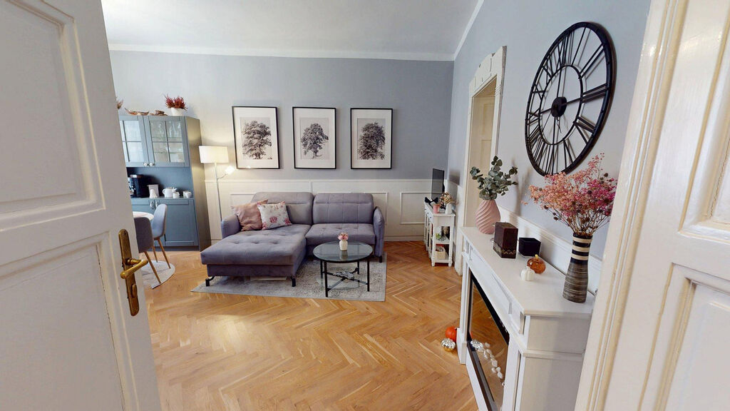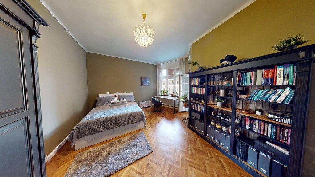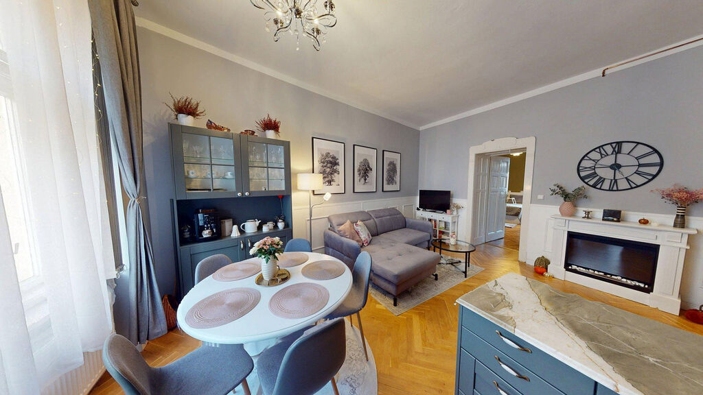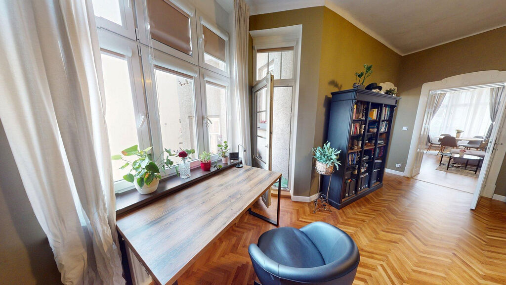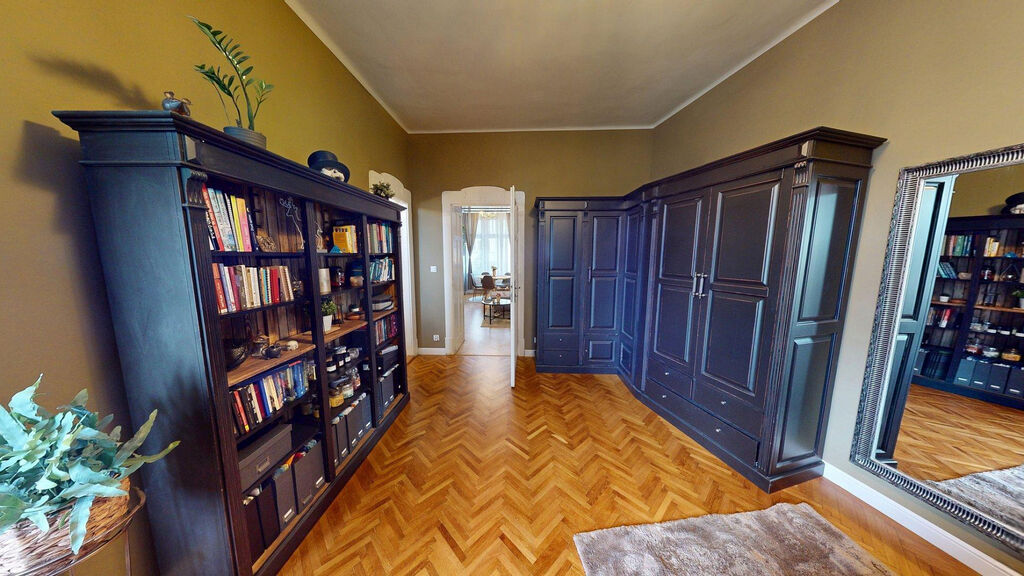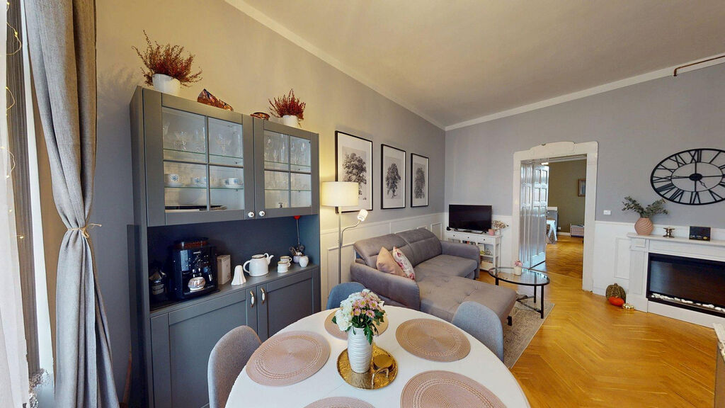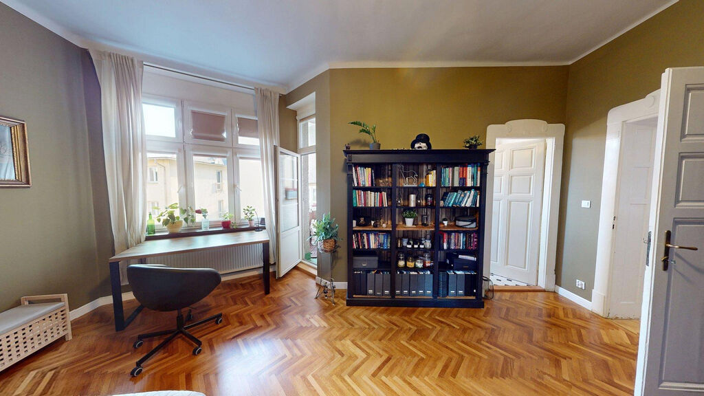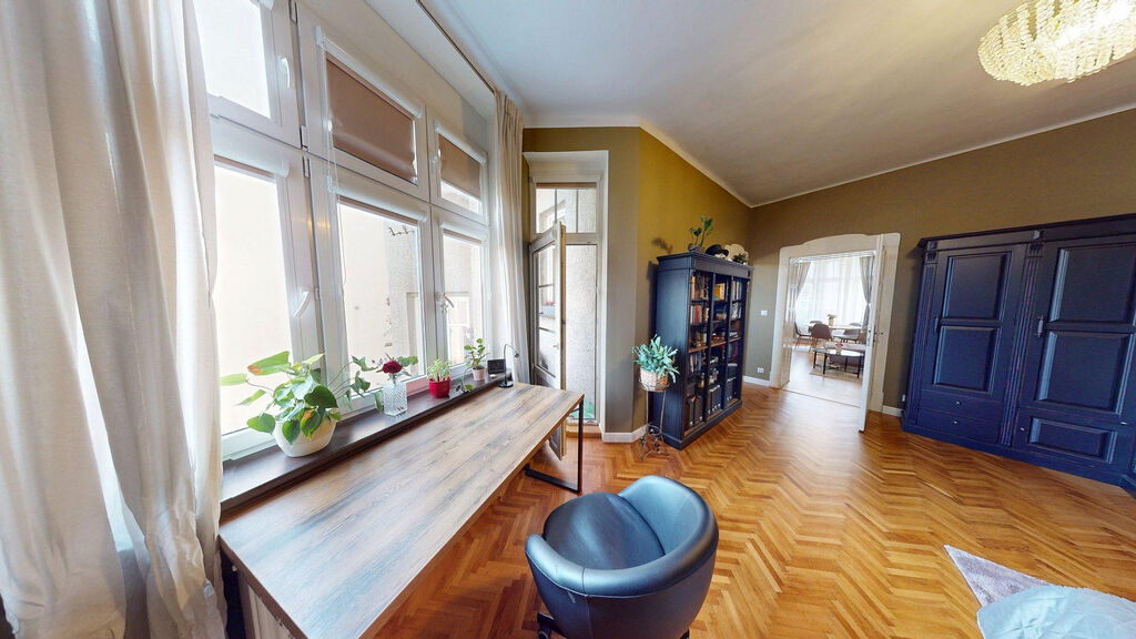 Tento byt Vás okamžitě okouzlí svou jedinečnou atmosférou noblesní dispozice navozující pocit bydlení na zámku. Majitelka při rekonstrukci kladla velký důraz na zachování historického rázu interiéru a genia loci cihlového domu. Každý detail byl promyšlen - od renovovaných dřevěných podlah a parket, přes výběr nábytku až po doplňky. Vše bylo citlivě sladěno tak, aby byt působil harmonicky a zůstal věrný duchu starého měšťanského domu v centru Ostravy.