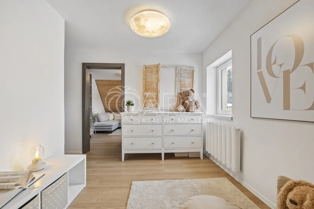 V patře (2. NP): Zde se nachází klidová zóna s velkou hlavní ložnicí, dětským pokojem, prostornou kanceláří a druhou, hlavní koupelnou.