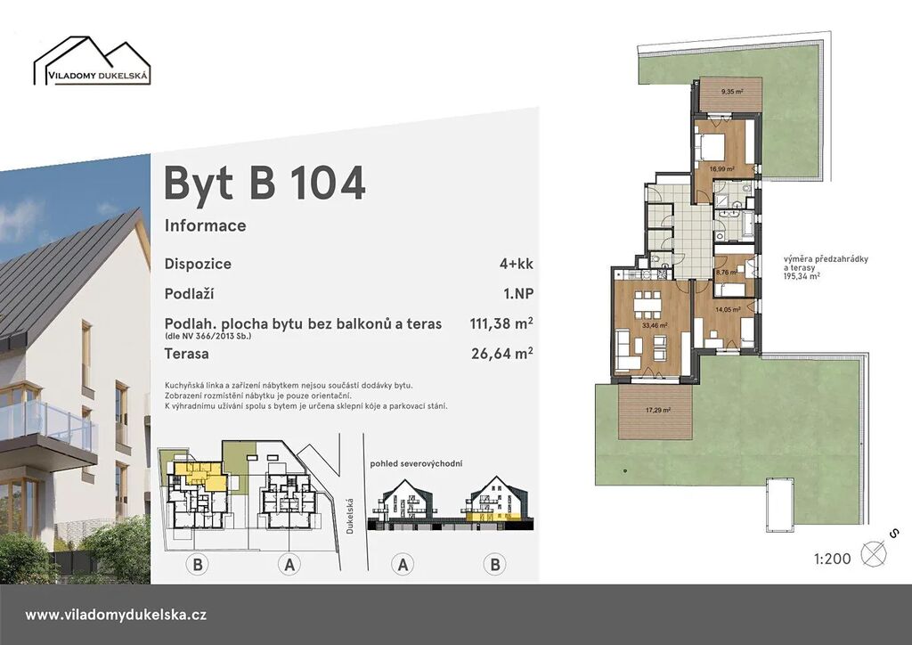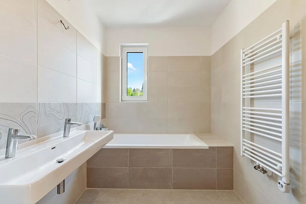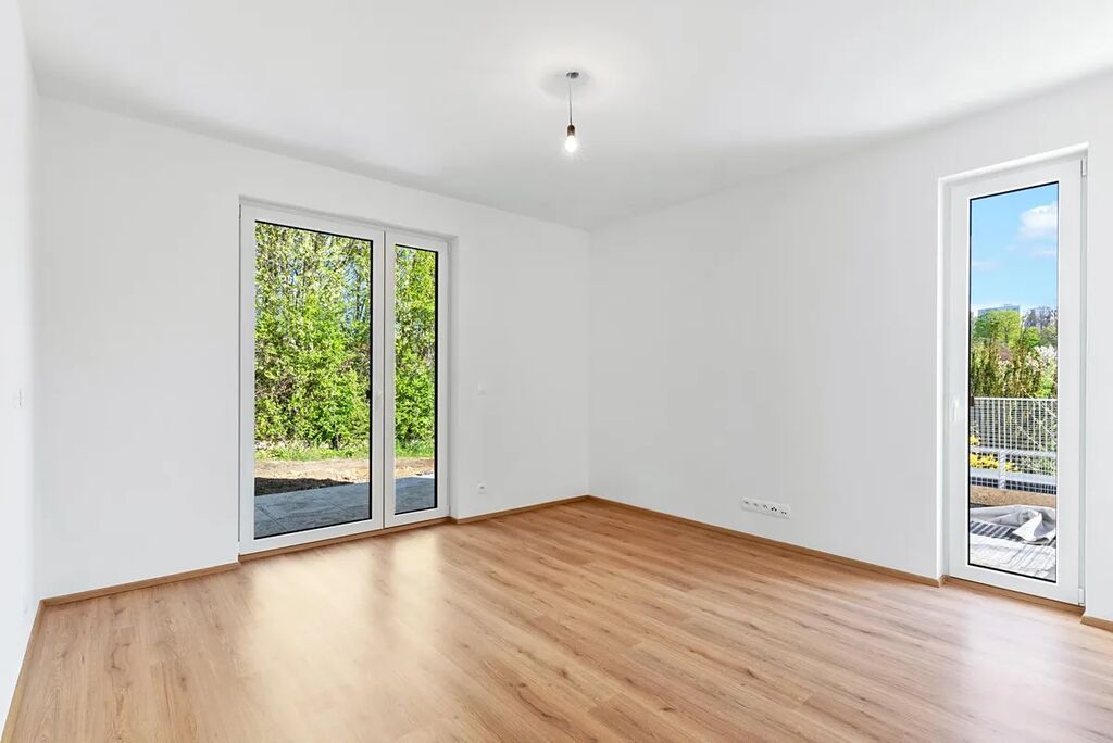 Díky francouzským oknům s izolačními trojskly je tento byt nádherně přirozeně prosvětlen a umožňuje vstup na zahradu ze všech místností. Byt je vybaven podlahovým vytápěním s termostatem v každé místnosti, což vám umožní efektivní regulaci teploty podle vašich potřeb. Kuchyňská linka není součástí vybavení, můžete si ji navrhnout přesně podle vlastních představ a stylu. K bytu náleží prostorná sklepní kóje umístěna v 1. podzemním podlaží.