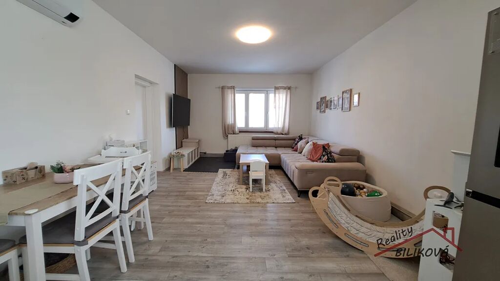 2.NP předsíň, obývací pokoj s kuchyní 35,8m2, ložnice23,7m2, pokoj 5,8m2, koupelna, WC a komora.