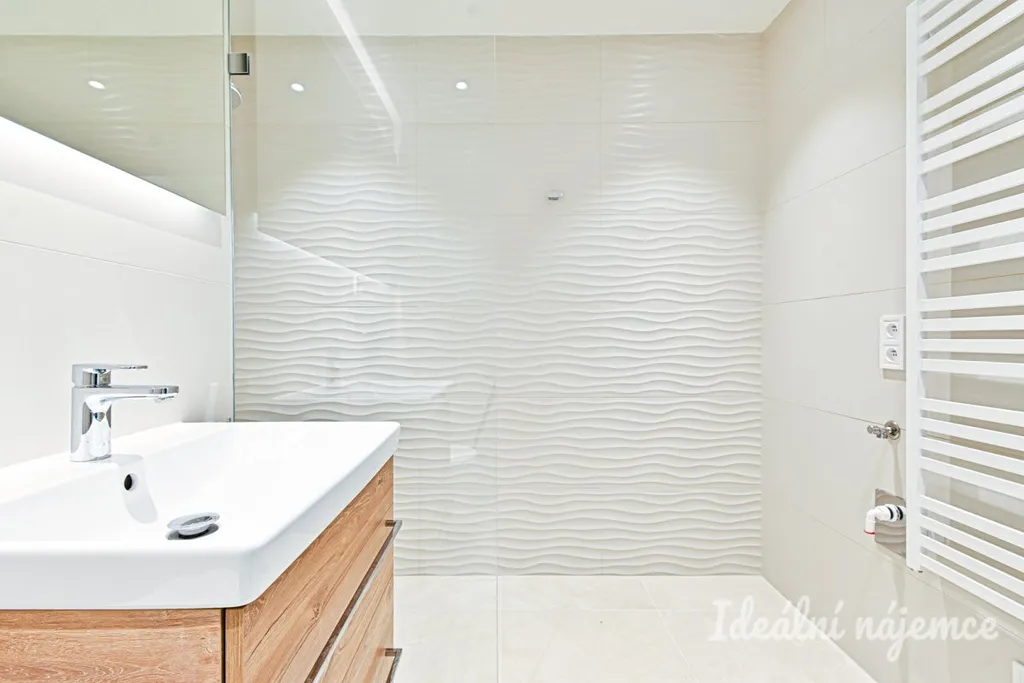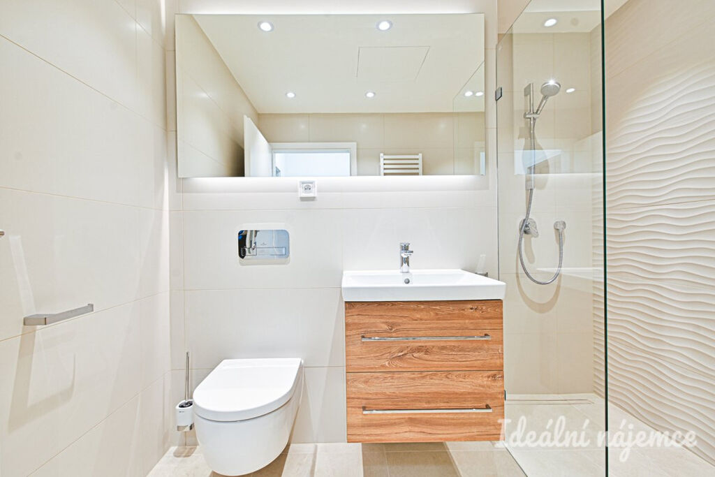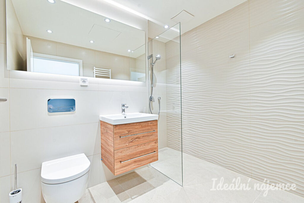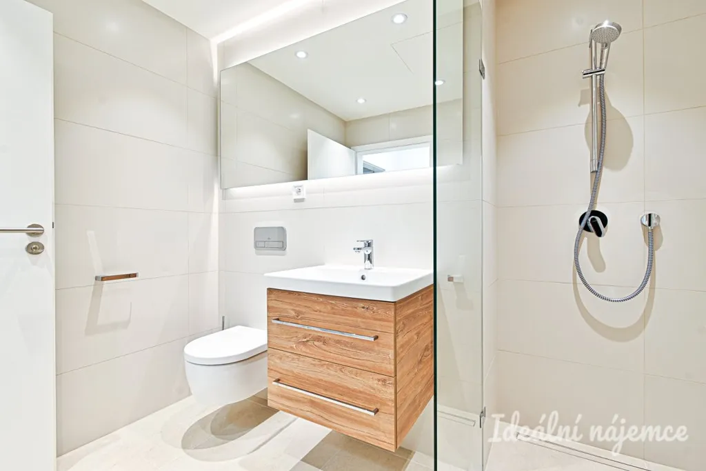 Stylová koupelna se pyšní elegantními velkoformátovými obklady v přírodních tónech, prostorným sprchovým koutem s černými designovými armaturami, závěsným WC a praktickou umyvadlovou skříňkou s úložným prostorem. LED podsvícení dodává koupelně moderní atmosféru.