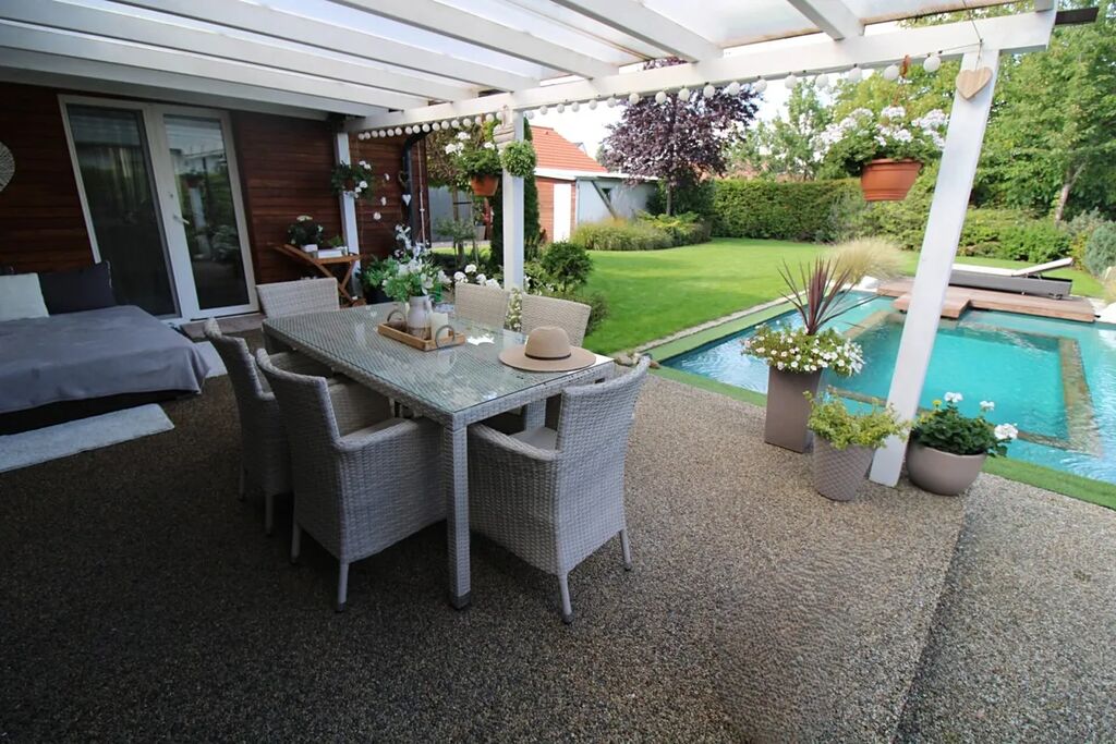 Z obývacího pokoje i z ložnic je přímý vstup na zastřešenou terasu, která nabízí ideální místo pro odpočinek i posezení s rodinou a přáteli. Na terasu navazuje pečlivě udržovaná zahrada s bazénem, poskytující naprosté soukromí.