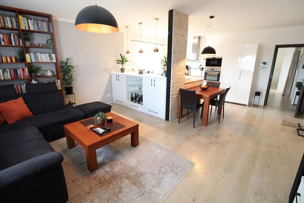 Dominantou interiéru je prostorný obývací pokoj s kuchyňským koutem, který přirozeně propojuje denní zónu domu a díky velkým oknům přivádí dovnitř dostatek světla. Součástí prodeje je kompletně vybavená kuchyňská linka se všemi vestavnými spotřebiči.