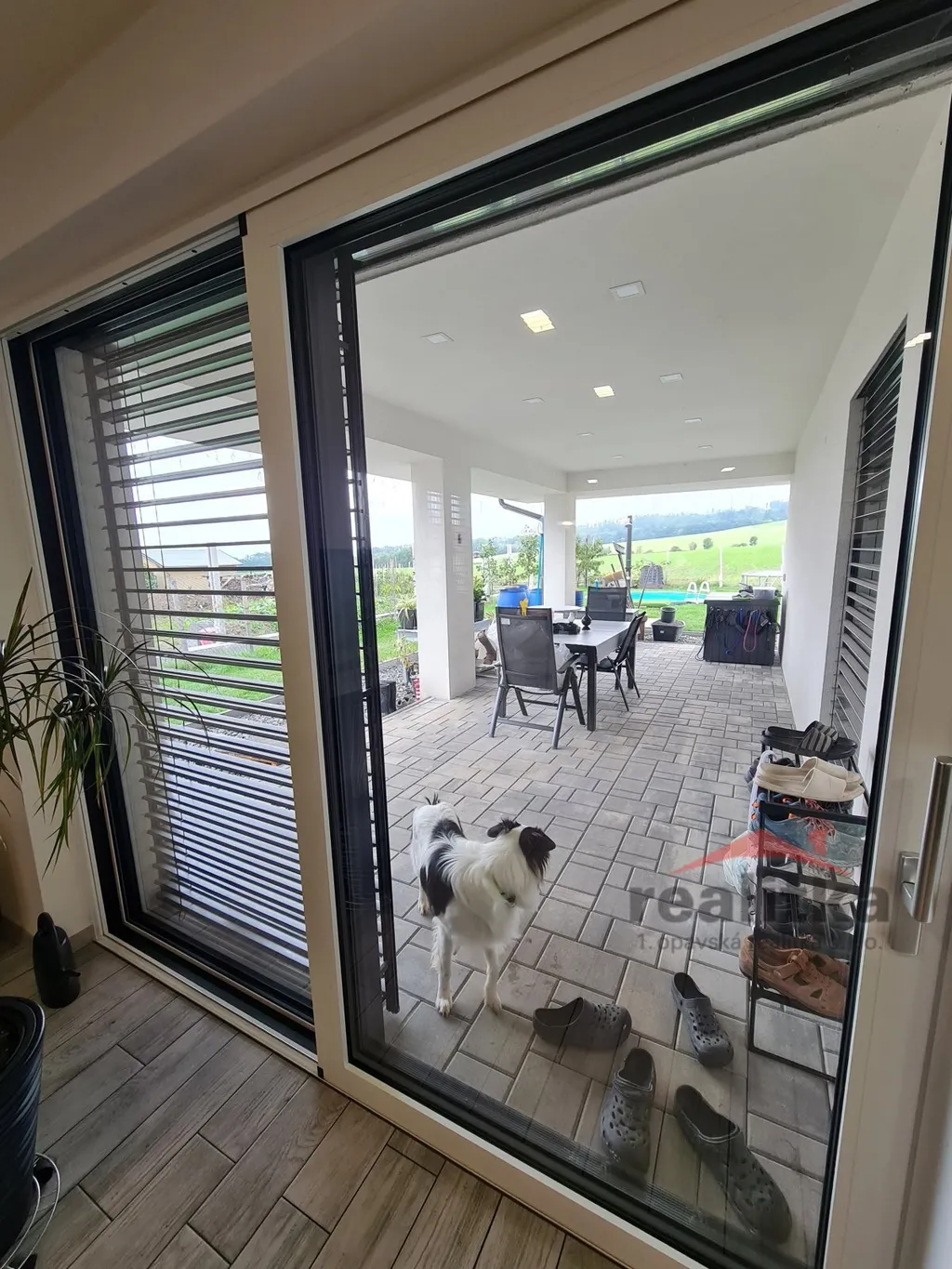 Nabízíme k prodeji novostavbu rodinného domu ve Štáblovicích, okr. Opava. Tento bungalov byl kolaudován v r. 2022, některé jeho části a systémy byly dokončeny teprve nedávno. K plnému dokončení chybí pouze zámková dlažba před domem (část stavebního materiálu je již nakoupena) a dodělání zahradního domku (je hotový dřevěný skelet). V domě je využita řada moderních technologií, např. ovládání venkovních žaluzií mobilem, centrální vysavač, nebo zónové podlahové topení. Na míru vyhotovená kuchyňská linka s ostrůvkem je vybavena myčkou nádobí, indukční varnou deskou, horkovzdušnou troubou, mikrovlnkou a americkou lednicí. Je zde kamerový zabezpečovací systém s čidly pohybu. Stavba vyhovuje nejvyšším požadavkům na energetickou náročnost. Obvodové zdi jsou z cihelného systému Porotherm 30 cm, zatepleno fasádním polystyrenem 20 cm, okna s trojskly, stropy zatepleny minerální izolací 33 cm, střešní krytina - tašky Tondach. O vytápění a ohřev vody se stará nové tepelné čerpadlo. Interiér tvoří 3 pokoje, velký obývací prostor s jídelnou a kuchyní, koupelna 2 x WC, komora, sklad a prostorná garáž s dálkově ovládanými vraty. Z terasy je krásný výhled na východní stranu do otevřené krajiny - tato část katastru Štáblovice je vedena jako zemědělská půda a není zde možná další výstavba. Obec je velmi klidná, je zde mateřská školka a první stupeň základní školy. Vzdálenost do centra Opavy je cca 10 km, což je necelých 14 min. jízdy automobilem. V okolí jsou lesy s cyklostezkami, rybník a mnoho dalších zajímavých míst.